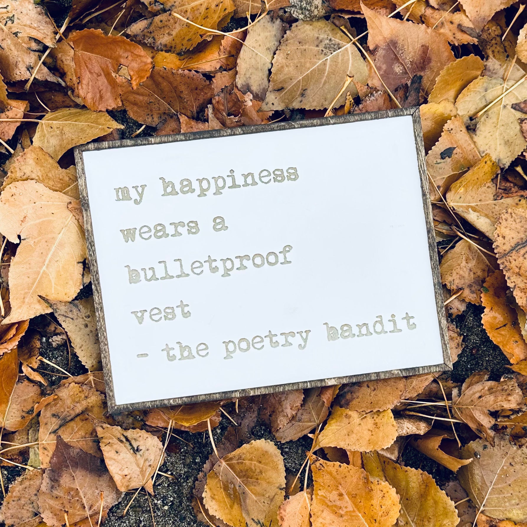 • Features the quote: “My happiness wears a bulletproof vest” by The Poetry Bandit.