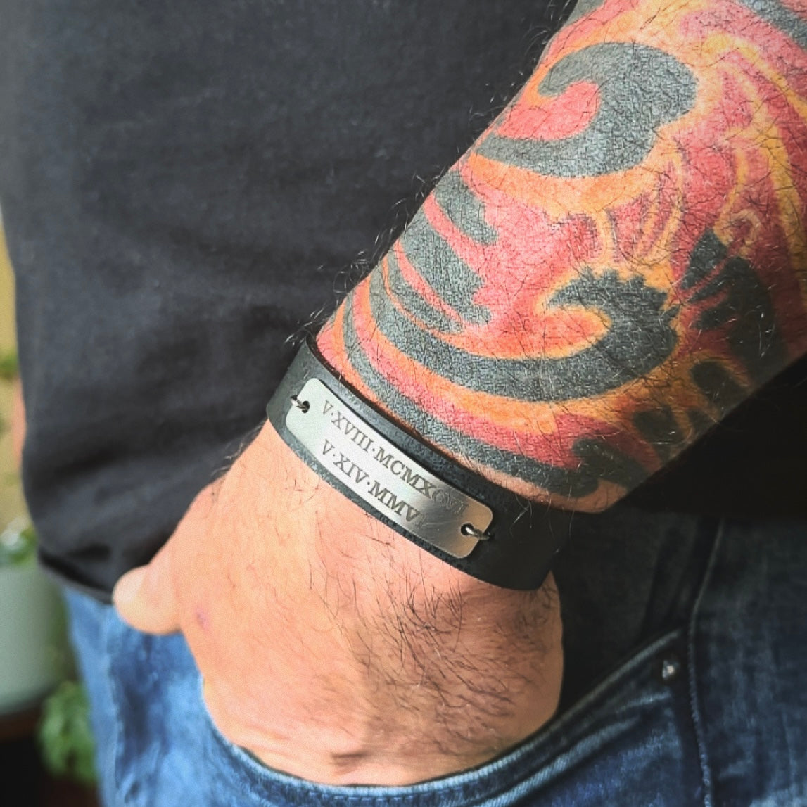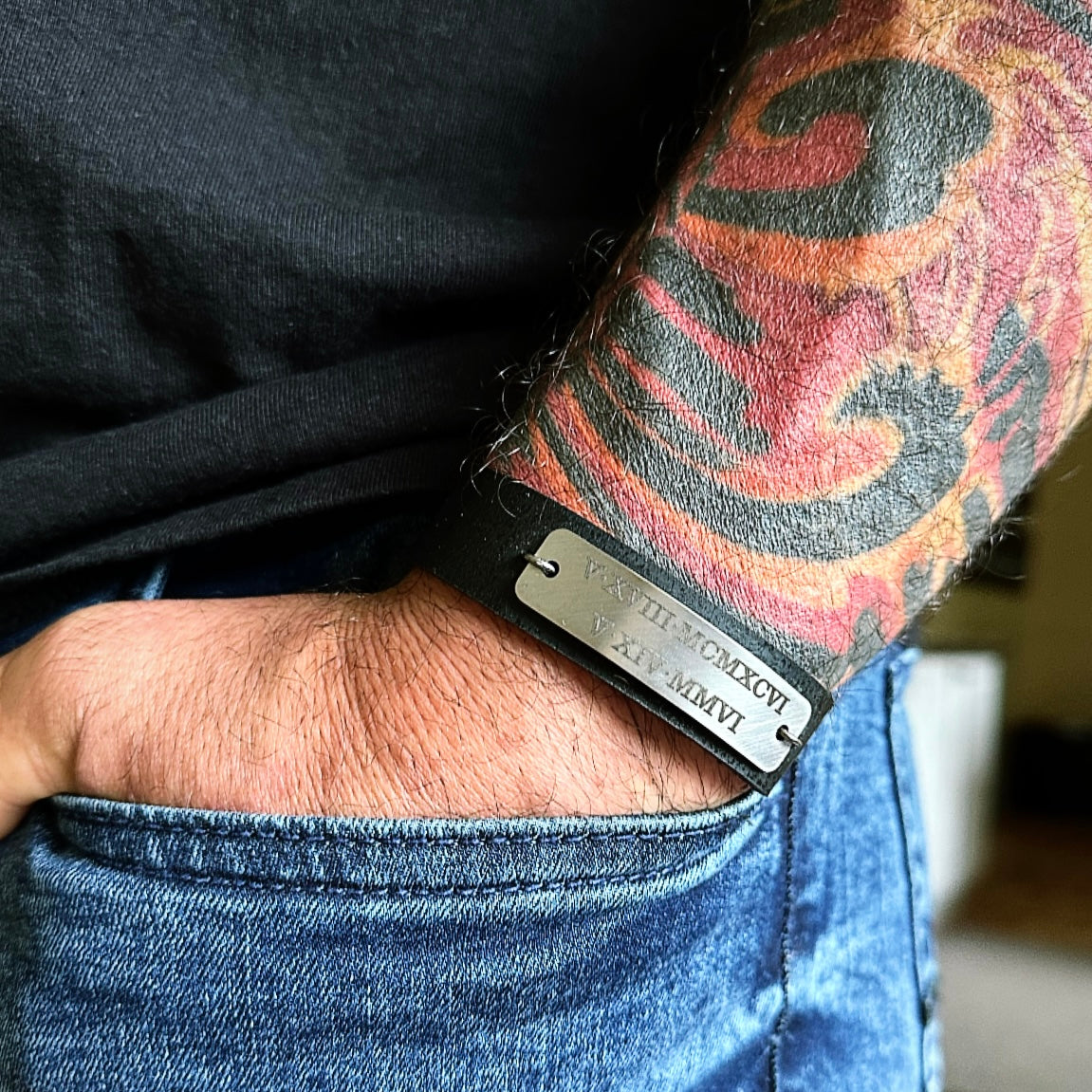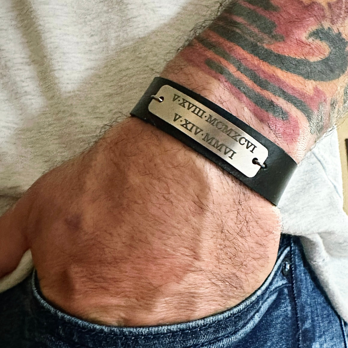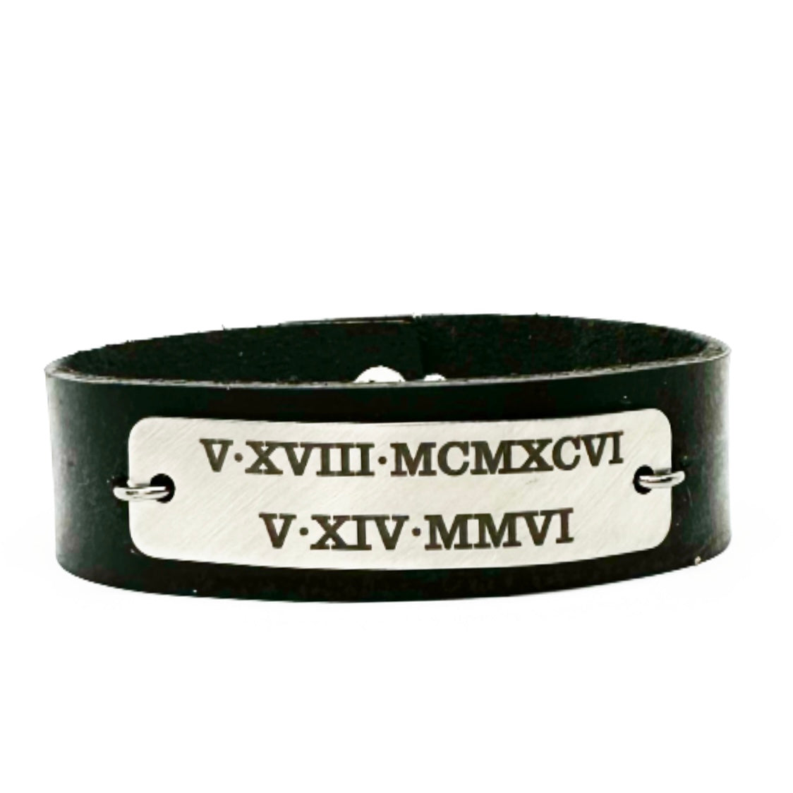 - Customize your metal leather bracelet with your loved ones birth dates, names or a special quote