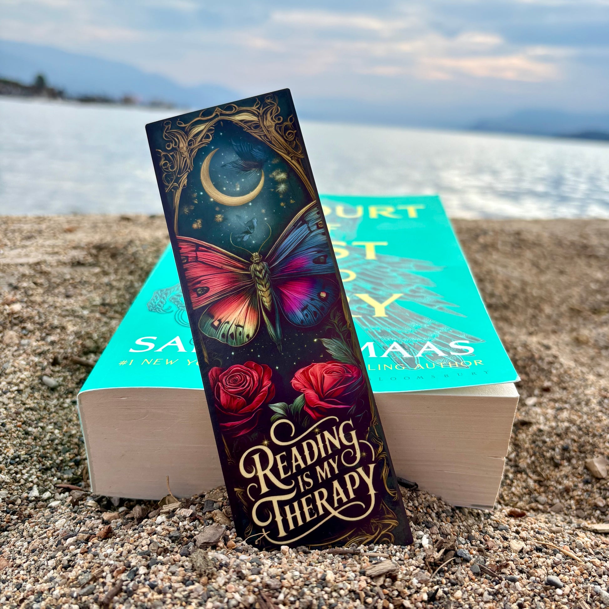 - Features moon, butterfly, and rose artwork with the words Reading is my therapy