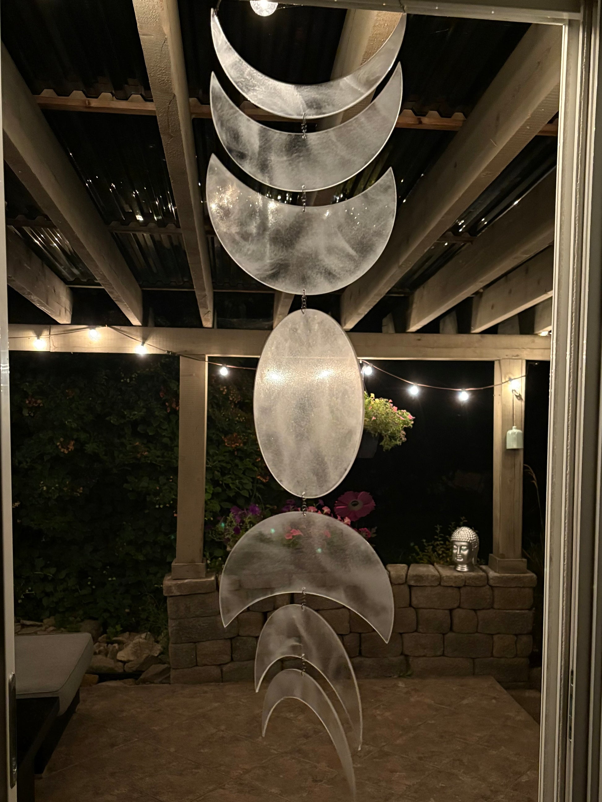 Each moon is made from 3mm acrylic, carefully buffed by hand to create a soft, frosted glow that captures the essence of moonlight. Linked together with delicate metal rings, Soul Phases flows naturally, catching light and creating subtle motion that feels both soothing and mesmerizing.